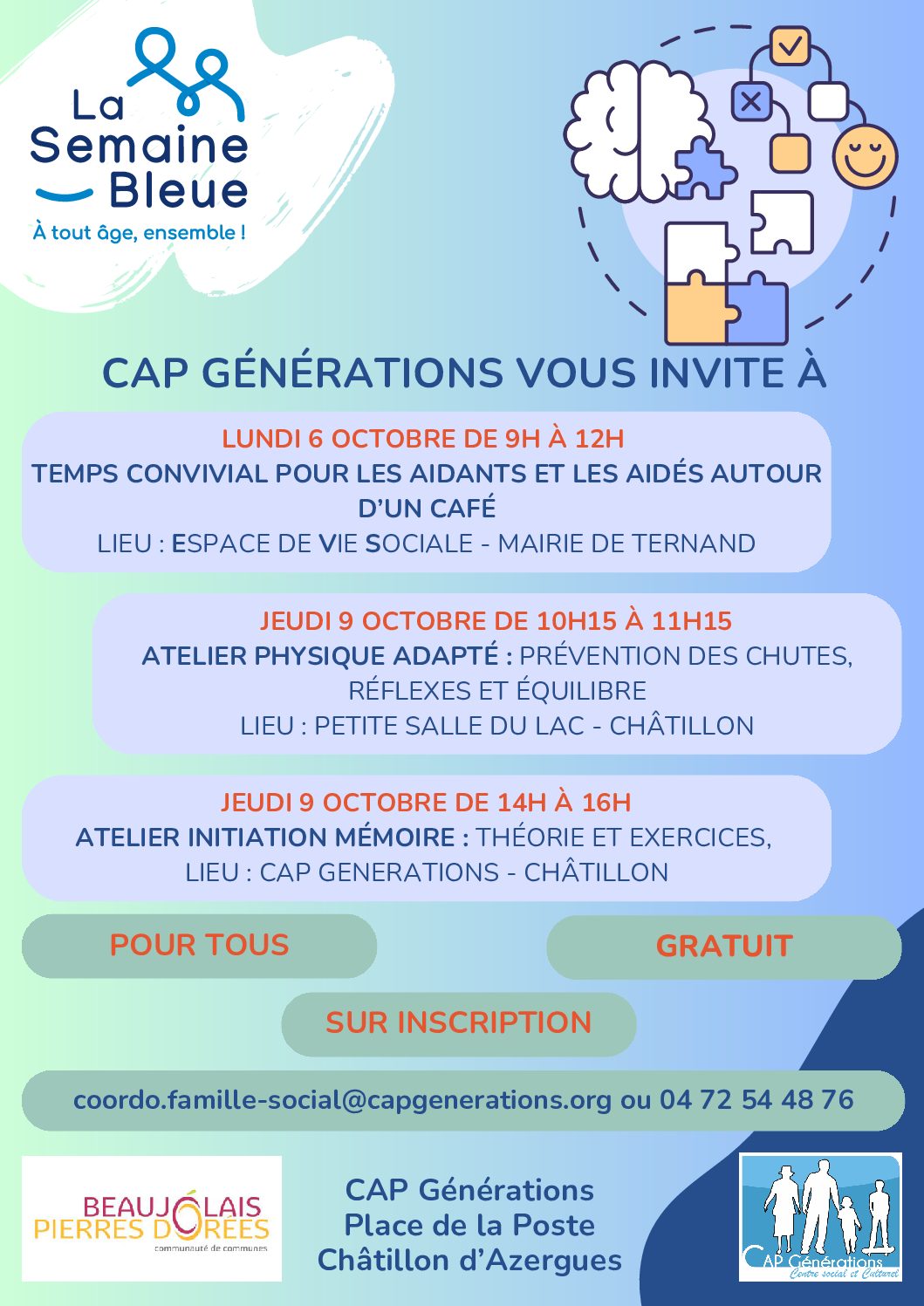 Programme semaine bleue de CAP Temps convivial aidants/aidés, atelier physiques adaptés et atelier mémoire… découvrez le programme ! Lire la suite » 29 septembre 2025 La une de l'actu, Seniors