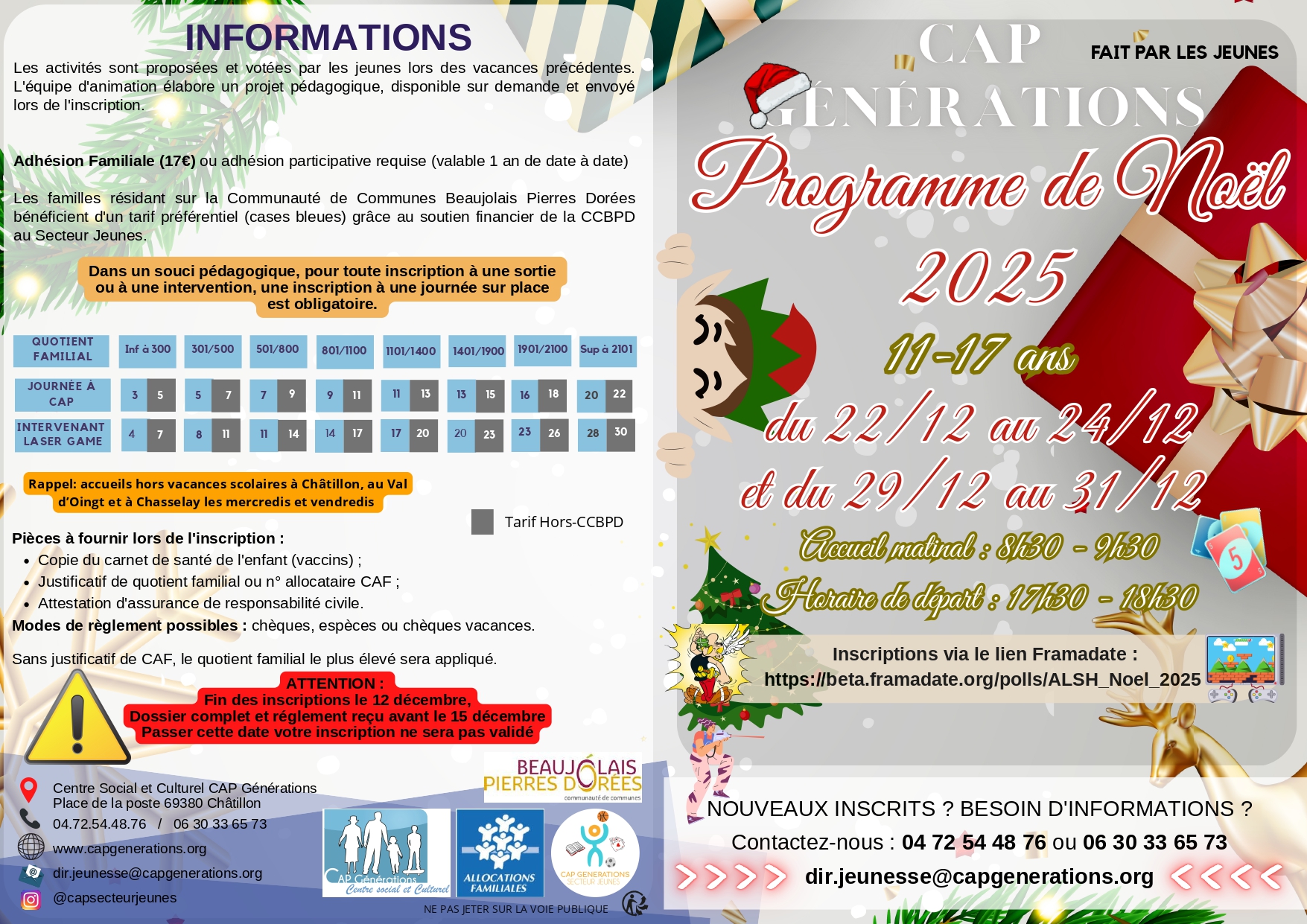 Actu Ados Programme 11-17ans Hiver 2025 Disponible ! Un programme hivernal !! Des activités d’intérieurs dynamique avec des journées « jeux télévisées », « Casino », une « sortie à la patinoire » qui nous avait été grandement demandées et une « intervention DJ » pour vous initier à la musique électro ! Inscrivez vous vite !! Nouveaux inscrits attention à bien nous notifier votre mail en commentaire et à valider votre choix !! 36 places maximum par jour, toute inscription à 1 sortie/intervention ou + = 1 journée minimum à CAP Lien des inscriptions : https://framadate.org/ALSH-hiver-2025 Téléchargez le programme Rejoins-nous sur Instagram : Instagram Suivez l’actualité des…